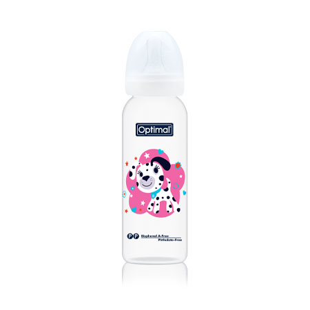 A non-toxic feeding bottle (6m+) with a round nipple and a narrow neck. Dishwasher-safe/ Sterilizer-safe.