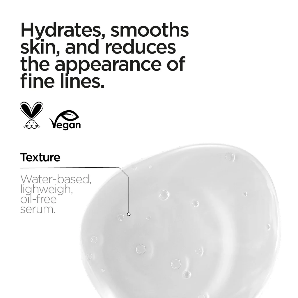 s a hydrating fluid for face and neck. Hyaluronic Acid (HA) is a substance found naturally in our skin. It works by preventing loss of moisture and retaining it in the skin, which helps keep it hydrated and plump throughout the day. Hyaluronic Acid contributes to the fresher and smoother appearance of the skin. The serum formula is light and quickly absorbed.